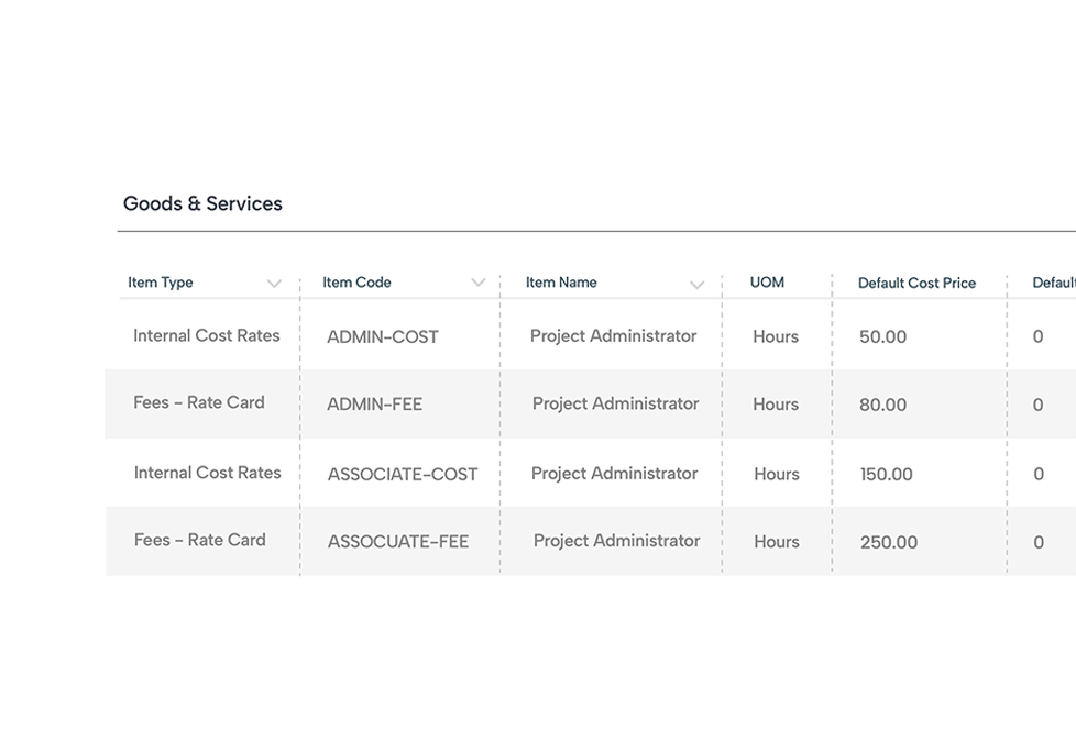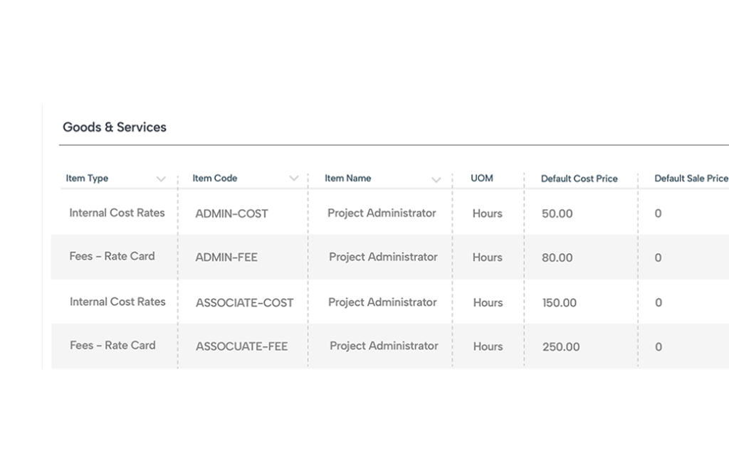 Clio Operate enables businesses to maintain predefined lists for items that the business purchases, or services that the business offers. This list is fully extendable and includes purchase items / discount, fixed price services, and rate cards.